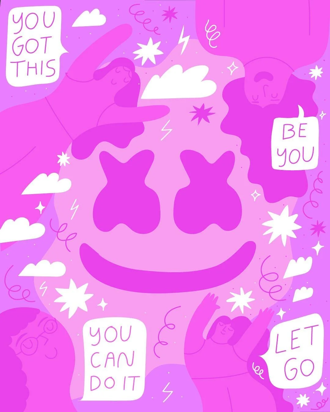 Illustrations of characters around with positive messages, positive affirmations and words of encouragement, inspired by the positivity that fuels Marshmellow’s music. And we could all go with a little bit of positive encouragement this year.