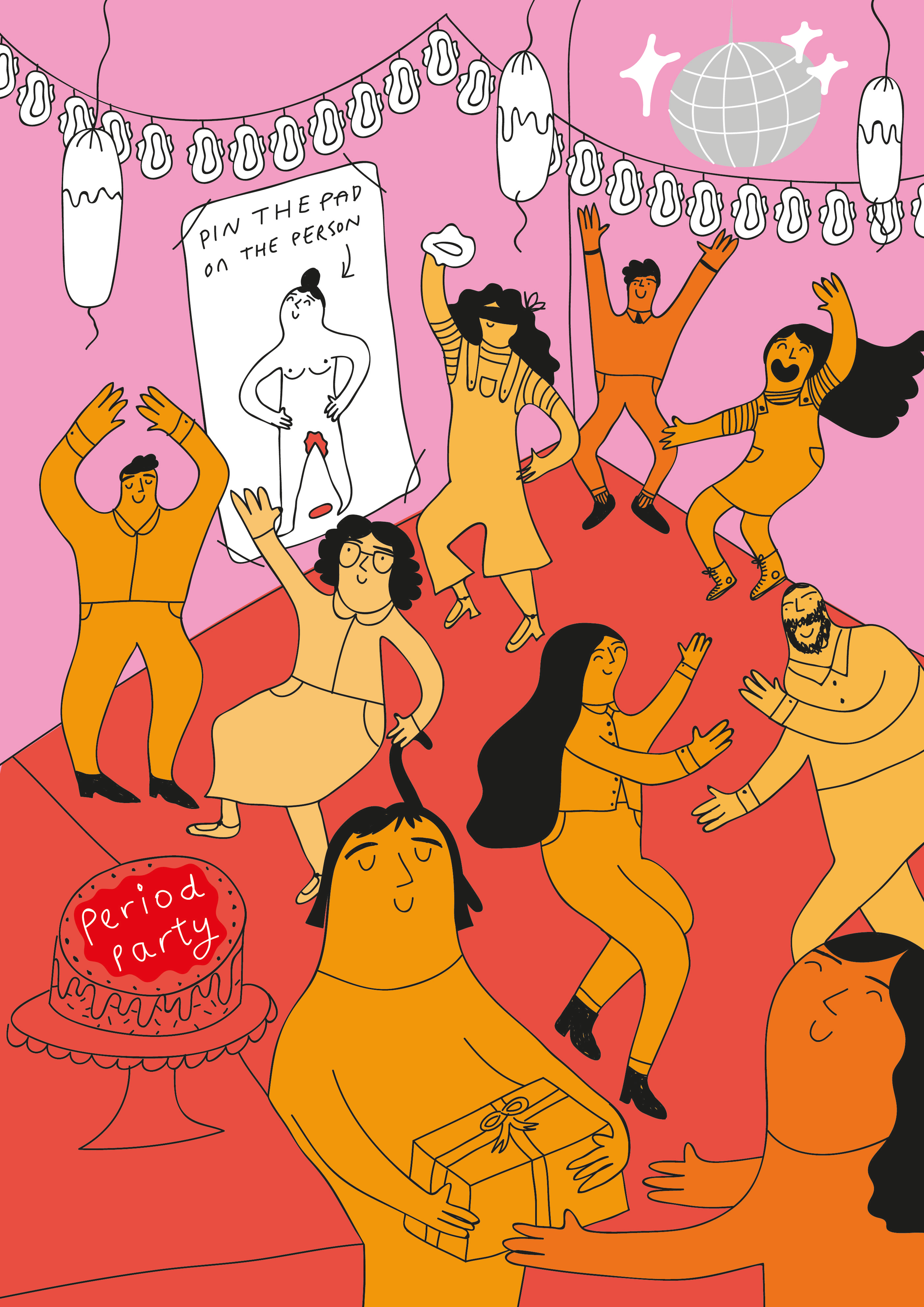 Editorial of a Period party illustration for @thisperiodinmylife, a period guide book and journal with Saskia Boujo.